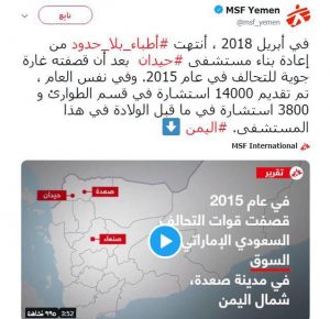 وقالت المنظمة في تغريدة على حسابها في تويتر رصدها (أفق نيوز) إنها انتهت في أبريل من العام نفسه من إعادة بناء هذا المستشفى الذي دمرته غارات تحالف العدوان السعودي الأمريكي في العام 2015م ..