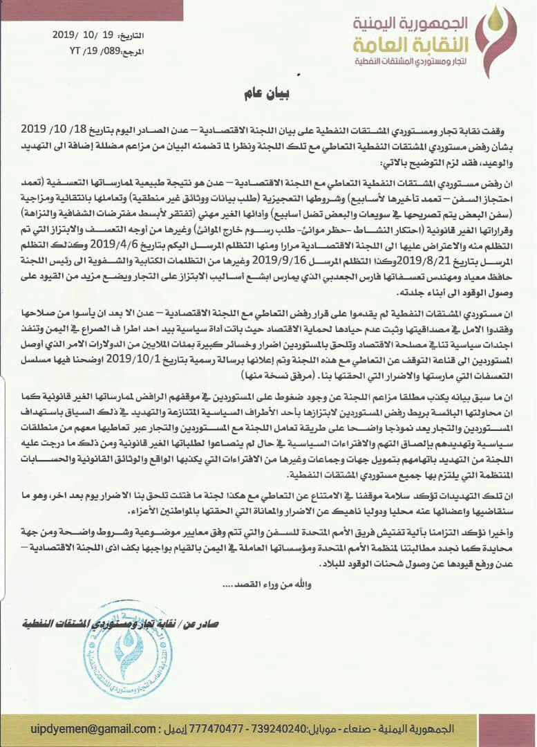 وأكدت أن أداء هذه اللجنة غير مهني وتفتقر لأبسط مفترضات الشفافية والنزاهة بالإضافة إلى أن قراراتها غير قانونية (احتكار النشاط- حظر موانئ- طلب رسوم خارج الموانئ) وغير ذلك من أوجه التعسف والابتزاز الذي تم التظلم منه والاعتراض عليه إلى اللجنة الاقتصادية مرارا ومنها التظلمات المرسلة بتاريخ 6 إبريل و21 أغسطس 16 سبتمبر 2019م وغيرها من التظلمات الكتابية والشفوية إلى رئيس اللجنة حافظ معياد ومهندس تعسفاتها فارس الجعدي الذي يمارس أبشع أساليب الابتزاز على التجار ويضع مزيد من القيود على وصول الوقود.