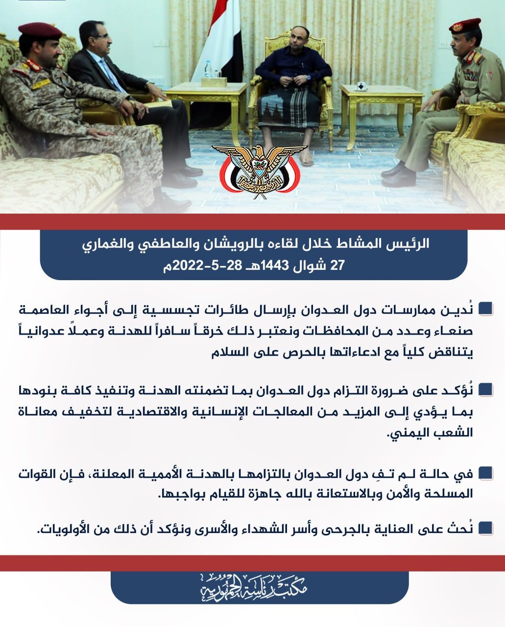وفي اللقاء أدان الرئيس المشاط ممارسات دول العدوان بإرسال طائرات تجسسية إلى أجواء العاصمة صنعاء وعدد من المحافظات، معتبراً ذلك خرقاً سافراً للهدنة وعملاً عدوانياً يتناقض كليا مع ادعاءاتها بالحرص على السلام.