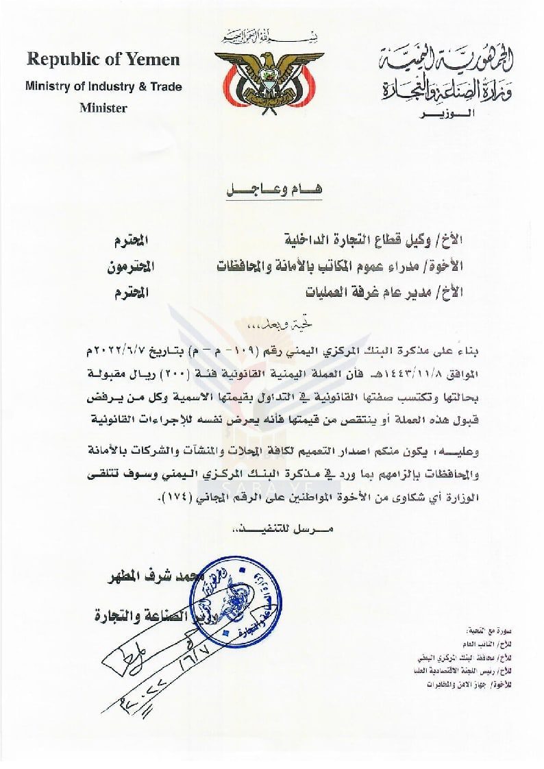 وجه وزير الصناعة والتجارة في حكومة الإنقاذ الوطني محمد شرف المطهر، بإصدار تعميم تحذيري لكافة المحلات التجارية والمنشآت والشركات بأمانة العاصمة صنعاء والمحافظات، بالإلتزام بما ورد في مذكرة البنك المركزي اليمني بخصوص العملة فئة 200 ريال.