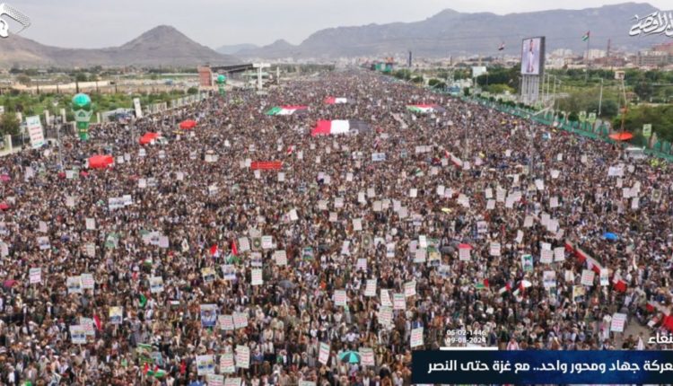 حشود مليونية بالعاصمة صنعاء في مسيرة “معركة جهاد .. ومحور واحد.. مع غزة حتى النصر”
