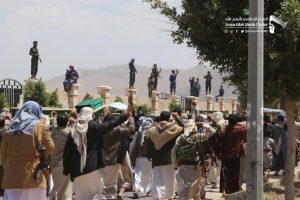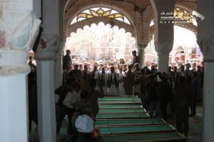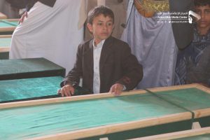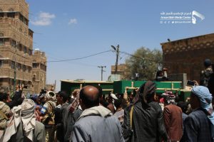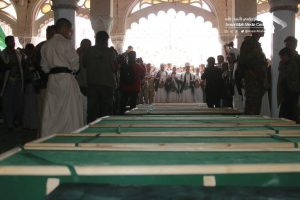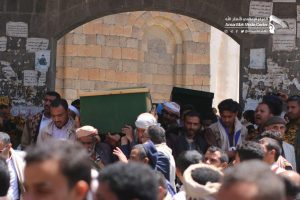 شٌيعت بصنعاء اليوم في موكب جنائزي مهيب جثامين 17 من شهداء جريمة کشر بمحافظة حجة من الأطفال والنساء والتي ارتكبها طيران العدوان في منطقة مغربة طلان بمديرية کشر وراح ضحيتها العشرات من الشهداء والجرحى.