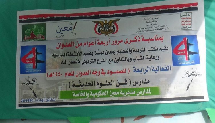 إلى ذلك نظمت عدد من المدارس الحكومية والأهلية بمديرية معين فعاليات وإذاعات مدرسية في إطار مرور أربعة أعوام من الصمود في وجه العدوان.