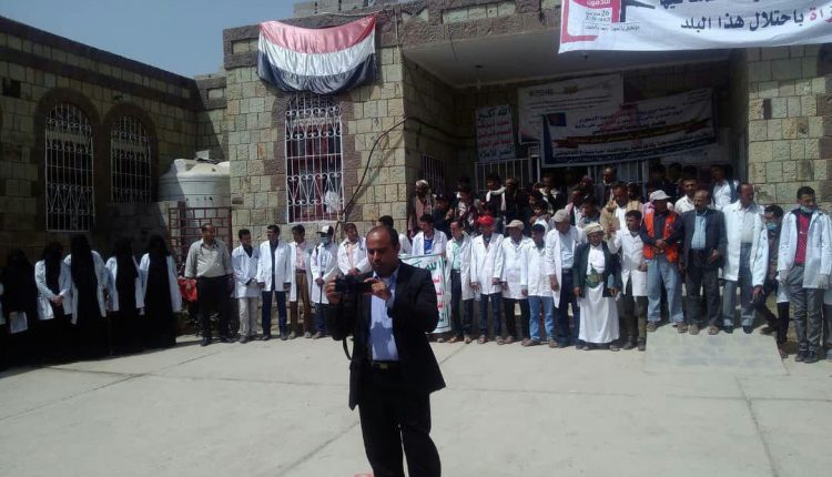 الكادر الطبي والفني بالمستشفى الريفي بمديرية الشغادرة يقيم وقفة احتجاجية لذكرى مرور اربعة اعوام من الصمود