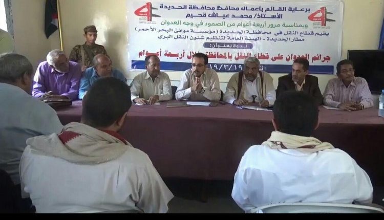 نظم قطاع النقل بمحافظة الحديدة “مؤسسة موانئ البحر الأحمر ومطار الحديدة والهيئة العامة لتنظيم شئون النقل البري” ندوة بعنوان ” جرائم العدوان على قطاع النقل بالمحافظة خلال أربعة أعوام” .