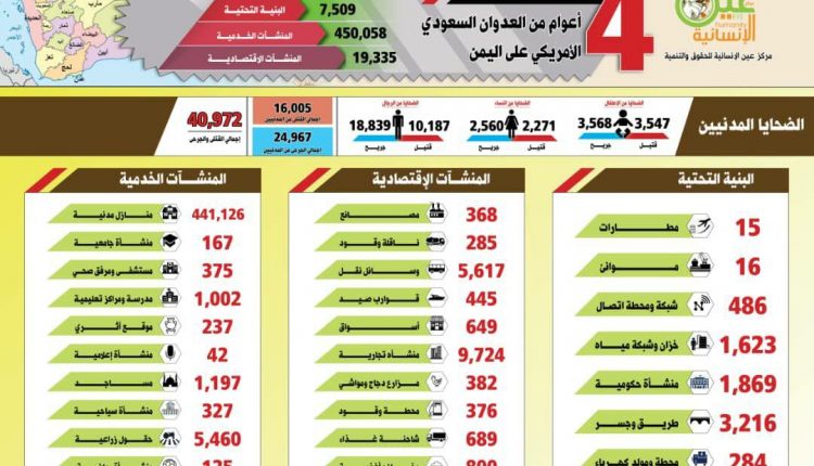 وقال التقرير الصادر عن مركز عين الإنسانية للحقوق والتنمية جرائم العدوان وغاراته على اليمن طيلة السنوات الأربع الماضية أسفرت عن اشتهاد وجرح أكثر من  40972 مدنياً بينهم 7115 طفل وطفلة.