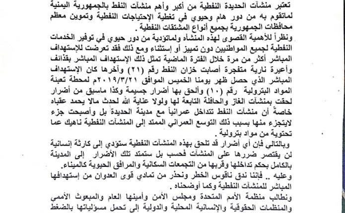 حذرت شركة النفط اليمنية فرع الحديدة من الاعتداءات المستمرة لقوى تحالف العدوان ومرتزقتها على المنشات النفطية بالمحافظة والتي قد تخلف كارثة إنسانية كبرى يكتوي بها كل أبناء الشعب..