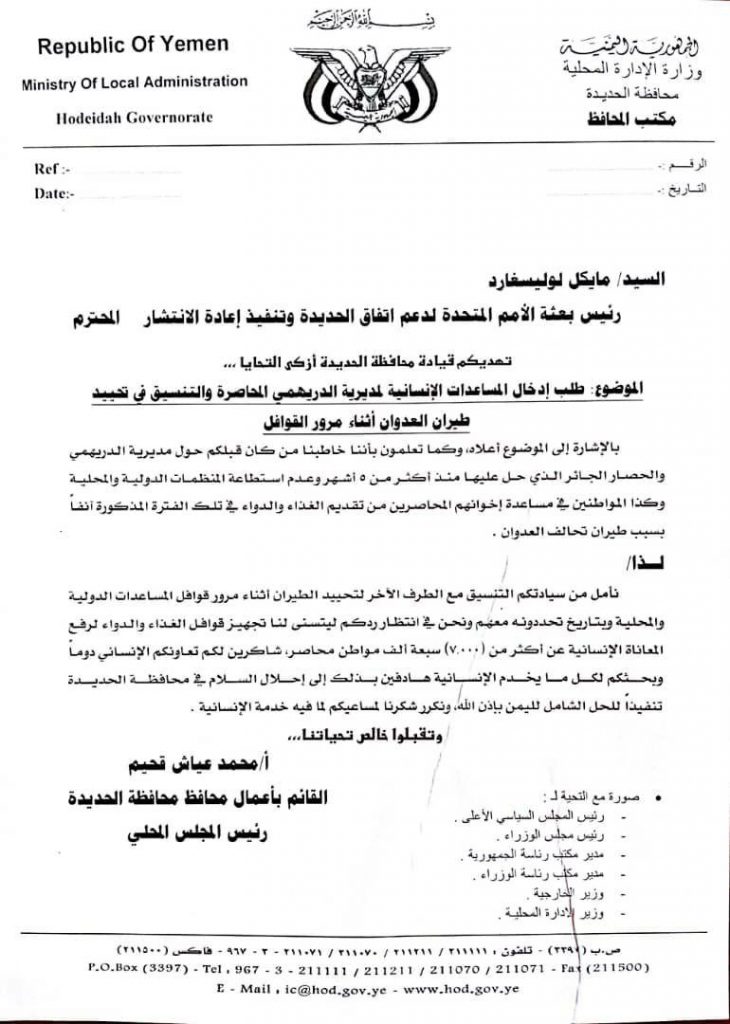قدم القائم بأعمال محافظ الحديدة / محمد عياش قحيم اليوم الأحد 24 رجب طلباً إلأى رئيس بعثة الأمم المتحدة الجنرال مايكل لوليسغارد تضمن التنسيق لإدخال قافلة مساعدات دولية ومحلية لمدينة الدريهمي المحاصرة .