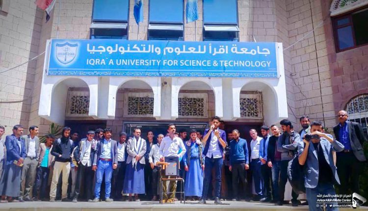 نظم طلاب جامعة اقرأ للعلوم والتكنولوجيا وقفة طلابية تنديداً باستمرار جرائم العدوان بحق أبناء الشعب اليمني وآخرها استهداف مدرسة وحي سكني في منطقة سعوان .