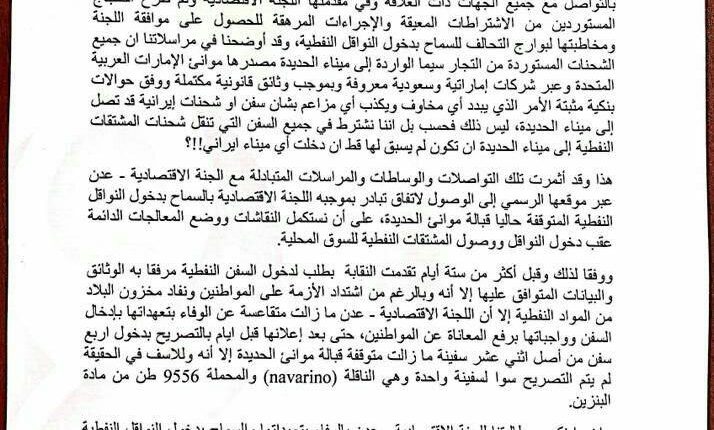 وأشارت النقابة إلى أنه وفي إطار جهودها لمعالجة إشكالية توقف النواقل النفطية قبالة موانئ الحديدة وعدم التصريح بدخولها من قبل اللجنة الاقتصادية – عدن، فإن النقابة بادرت بالتواصل مع جميع الجهات ذات العلاقة وفي مقدمتها اللجنة الاقتصادية وتم طرح احتجاج المستوردين من الاشتراطات المعيقة والإجراءات المرهقة للحصول على موافقة اللجنة ومخاطبتها لبوارج التحالف للسماح بدخول النواقل النفطية.