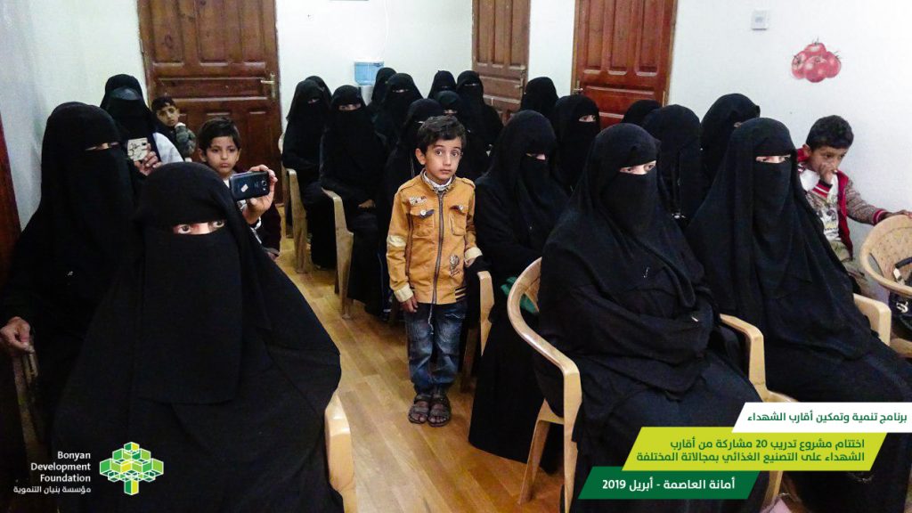 وهدف المشروع التدريبي خلال الفترة من 17 مارس – 24 أبريل 2019م، إلى اكساب 20 مشاركة من أقارب الشهداء عدد من المهارات والخبرات حول كيفية تصنيع و إنتاج العصائر ، الصلصة ، الشطة ، المعجنات، والمربيات والمخللات.