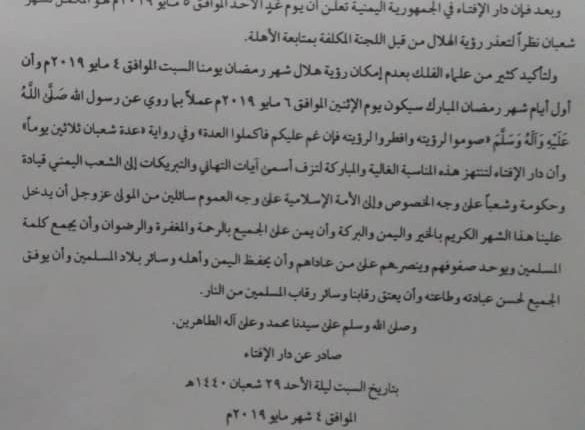 وقالت دار الإفتاء في بيان صادر عنها “إن يوم غد الأحد الموافق 5 مايو هو المكمل لشهر شعبان نظرا لتعذر رؤية الهلال من قبل اللجنة المكلفة بمتابعة الآهلة ولتأكيد كثير من علماء الفلك بعدم إمكان رؤية هلال شهر رمضان يومنا السبت الموافق 4 مايو، وإن أول أيام شهر رمضان، سيكون يوم الاثنين الموافق 6 مايو 2019م عملا بما روي عن رسول الله صلى الله عليه وآله وسلم” صوموا لرؤيته وافطروا لرؤيته فإن غمً عليكم فأكملوا العدة وفي رواية ” عدة شعبان ثلاثين يوما”.