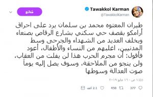 توعدت الناشطة اليمنية توكل كرمان ولي العهد السعودي محمد بن سلمان والذي وصفته بالمعتوه بالملاحقة والعقاب جراء جرائم طيرانه بحق المدنيين في اليمن .