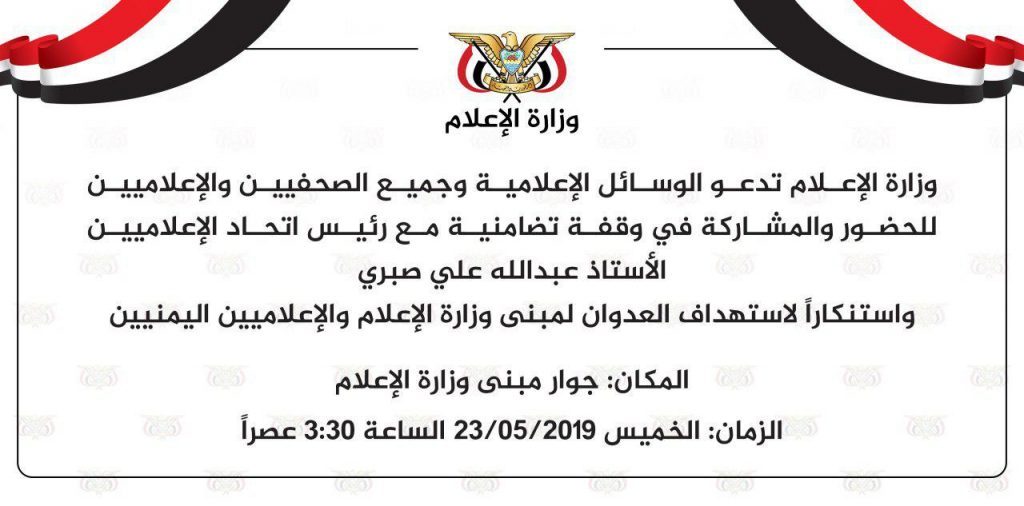 دعت وزارة الإعلام الوسائل الإعلامية و جميع الإعلاميين والصحفيين للحضور في وقفة تضامنية مع رئيس اتحاد الإعلاميين اليمنيين الاستاذ عبدالله الصبري واستنكارا لاستهداف العدوان لمبنى وزارة الإعلام والإعلاميين اليمنيين.