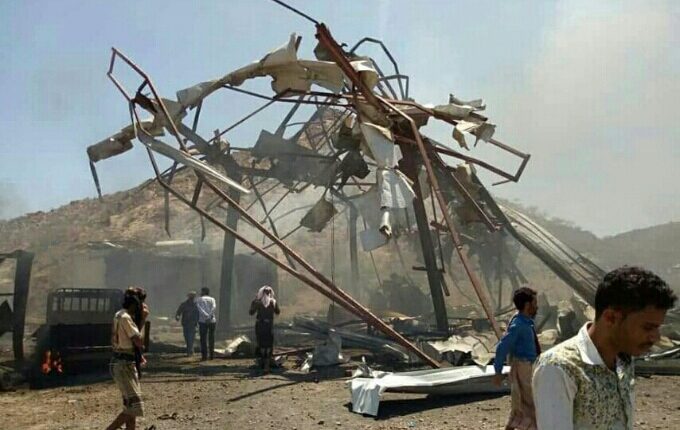 قام طيران تحالف العدوان السعودي الأمريكي أمس الجمعة باستهداف محطة وقود وموقف لتجمع عمال بيع للقات في مديرية ماوية بمحافظة تعز، ما أدى إلى سقوط 12 شهيد بينهم7 اطفال وإصابة واحد اصابته خطيرة، في جريمة جديدة تضاف الى سلسلة جرائم التحالف بحق المواطنين الآمنين وهذه المرة في سوق لهم وفي نهار رمضان وفي يوم الجمعة دون ان يرقبوا في دماء اليمنيين وحرمتها وفي الشهر الكريم وحرمته إلا ولا ذمة،