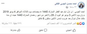 وقال الجوبي في بيان نشره يوم الأحد على صفحته في القي سبوك: إن أول أيام عيد الفطر المبارك سيصادف يوم الثلاثاء الموافق الرابع من يونيو المقبل 2019م ..