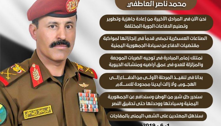أكد وزير الدفاع اللواء الركن/ محمد العاطفي أن قوات الجيش واللجان الشعبية الآن في المراحل الأخيرة من إعادة جاهزية وتطوير وتصنيع الدفاعات الجوية المختلفة.