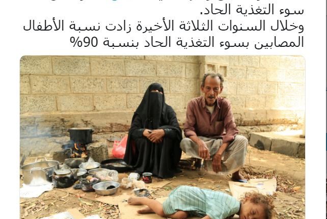 وقالت اللجنة في تغريدة على حسابها تويتر بالأمس : إن عدد الأطفال المصابين بسوء التغذية الحاد زاد خلال السنوات الثلاثة الأخيرة بنسبة 90% .