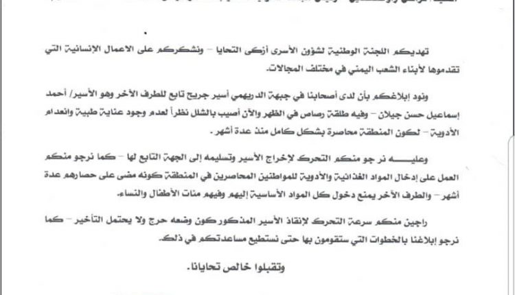 كما دعت اللجنة الوطنية لشؤون الأسرى البعثة الدولية للصليب الأحمر الدولي في اليمن لتوضيح ملابسات القضية وإعلانها للرأي العام.