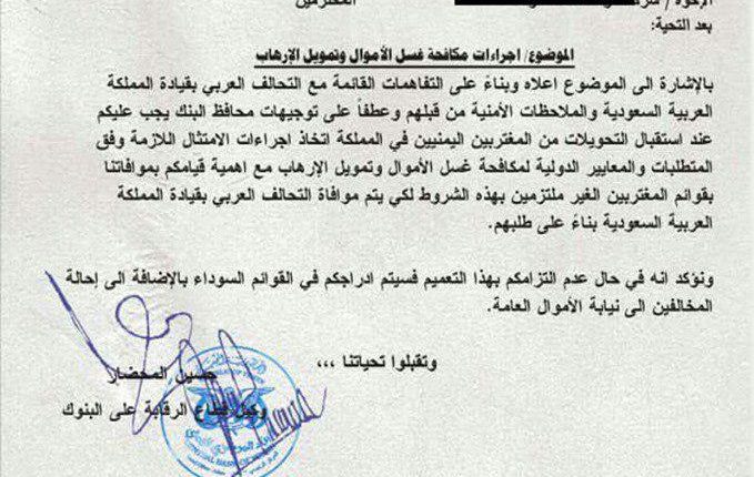 وأوضحت الوثيقة عن سلسلة الاجراءات العقابية التي انتهجها مسئولو بنك عدن المركزي عبر ايعاز وتوجيهات المعين من قبل العدوان السعودي الامريكي “حافظ معياد” باصدار توجيهات جديدة للتضيق على المغتربين اليمنيين تحت مسميات مفضوحة ومبررات واهية.