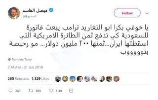 كتب الإعلامي السوري الشهير بقناة الجزيرة القطرية فيصل القاسم تغريدة اثارت السخرية في مواقع التواصل الاجتماعي ،قال فيها بان الرئيس الأميركي دونالد ترامب سيرسل فاتورة طائرة التجسس الاميركية التي اسقطها الحرس الثوري الى السعودية لكي تدفع ثمنها.