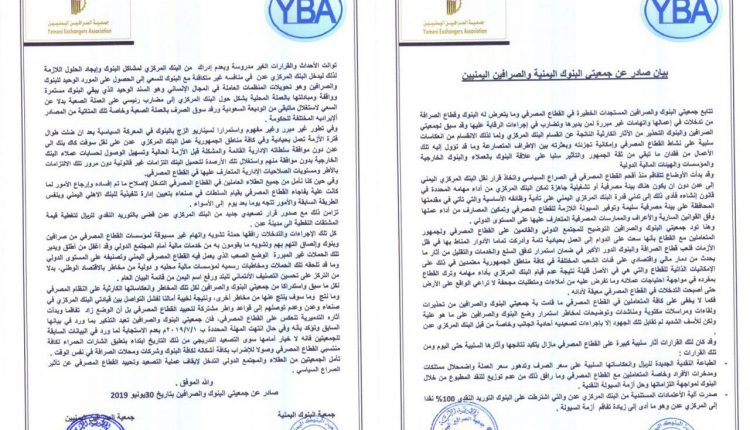 اصدرت جمعيتا البوك والصرافين اليمنيين بياناً عاجلاً عنها تعقيباً على ما ورد عنها في بيانها السابق.. مؤكدة بانه وفي حال انتهت المهلة المحددة بـ 1 يوليو 2019م بعدم الاستجابة لما ورد في البيانات السابقة للجمعيتين فانه لا خيار أمامها سوى التصعيد التدريجي من ذلك التاريخ ابتداءً بتعليق الشارات الحمراء لكافة منتسبي القطاع المصرفي وصولاً للإضراب بكافة اشكاله لكافة البنوك وشركات ومحلات الصرافة في نفس الوقت.