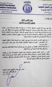 وقال المجلس في بيان له: إن إعلان تعليق الإضراب جاء بعد وعود تلقاها من رئيس حكومة المرتزقة المدعو / معين عبد الملك لحل الإشكال وبما يحفظ كافة حقوق شركة النفط في توزيع وبيع المشتقات النفطية.