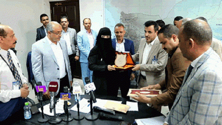 كرم وزير الصحة العامة والسكان الدكتور طه المتوكل اليوم الاثنين بالعاصمة صنعاء المخترعة ريهام المختاري الفائزة بالمركز الأول في المسابقة الوطنية لرواد المشاريع بابتكارها جهاز غسيل الكلى المنزلي.
