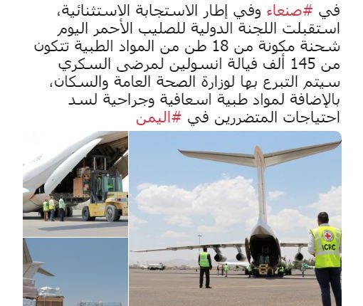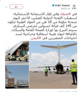 وقالت اللجنة الدولية في بيان عبر الحساب الرسمي لمكتبها باليمن على “تويتر” إن شحنة الأدوية المقدمة تأتي في إطار الاستجابة الاستثنائية بصنعاء .