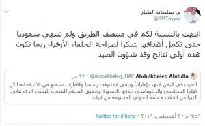 في الجانب الأخر كشف الدبلوماسي والكاتب السعودي السابق سلطان الطيار في رده على تغريدة مستشار بن زايد في تويتر بالقول : انتهت الحرب بالنسبة لكم في منتصف الطريق ولم تنتهي سعودياً حتى تكمل أهدافها حد زعمه .