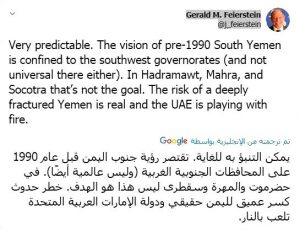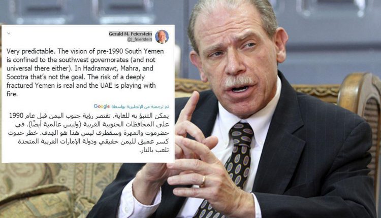 حذر السفير الأمريكي الأسبق لدى اليمن جيرالد فيرستاين من خطر تقسيم اليمن . وقال فيرستاين في تغريدة على توتير أمس الأحد رصدها (أفق نيوز): إن هذا الخطر بات قائماً إثر التطورات الأخيرة بعدن على يد مليشيا المجلس الانتقالي الجنوبي المدعومة من الإمارات. كما  حذر الدبلوماسي الأمريكي صراحة دولة الإمارات من اللعب بالنار في اليمن..
