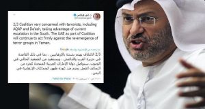 وقال وزير الدولة الإماراتي للشؤون الخارجية أنور قرقاش في سلسلة تغريدات له على تويتر: إن بلاده ستواصل استهداف التنظيمات الإرهابية حد تعبيره ما اعتبره مراقبون تأكيدا على استمرارها في قصف مرتزقة حكومة الفار هادي واللذين تصفها مليشيا الإمارات التابعة للانتقالي الجنوبي بالإرهابيين ..
