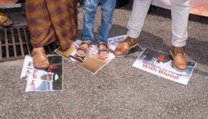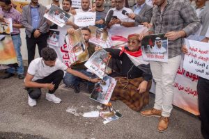 وفي الوقفة احرق المحتجون صور محمد بن زايد ولي عهد أبو ظبي وداسوا عليها بالأقدام تنديداً بدعم الإمارات لمليشيا الانتقال الجنوبي الساعية لتقسيم اليمن.