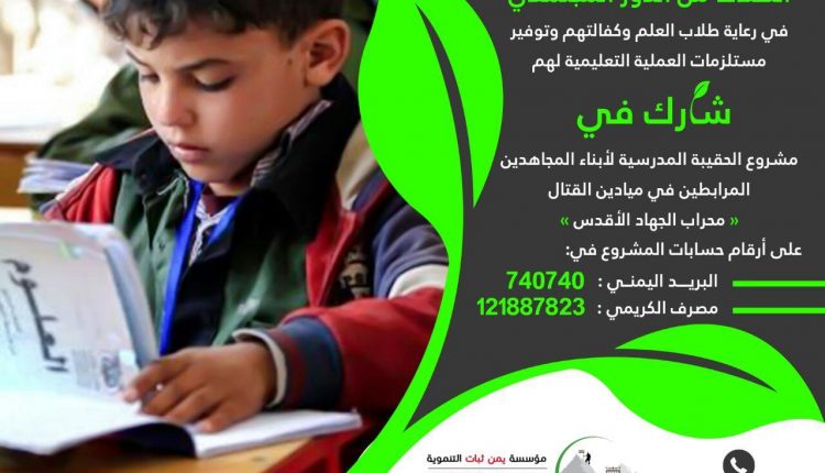 مؤسسة يمن ثبات تدعو للمشاركة في الحملة “الحقيبة والزي المدرسي” لأبناء المرابطين في ميادين الدفاع عن الأرض والعرض