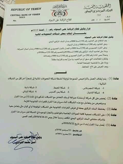 وبحسب القرار الذي يبدأ العمل به ابتداء من 22 سبتمبر الجاري، يحظر على كل شركة أو منشأة صرافة أو بنك التعامل مع هذه الشبكات المذكورة، وسيتعرض من يتعامل مع هذه الشبكات أثناء سريان هذا القرار للإجراءات القانونية.