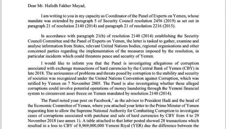 جاءت الرسالة الأممية إلى ما يسمى بمحافظ البنك المركزي السابق والمعين من قبل الاحتلال حافظ معياد، بشأن التحقيق في قضايا فساد البنك المركزي بعدن، كاشفة عن مرحلة مهمة في حياة الاقتصاد اليمني وحالة ما بعد قرار الفار هادي نقل البنك المركزي إلى عدن، ومسلسل نهب أموال وثروات الشعب اليمني حتى لحظة كتابة التقرير هذا والتي وصل فيها الاقتصاد اليمني إلى مرحلة الانعاش السريري.