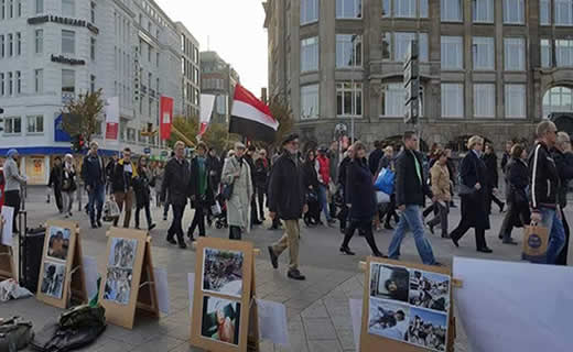 نظم أبناء الجالية اليمنية في المانيا اليوم الأحد 1 نوفمبر 2015 معرض للصور وسط مدينه هامبورج لكشف وفضح جرائم العدوان بحق الشعب اليمني.