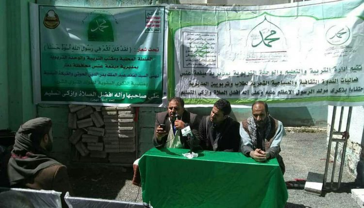 نظم اليوم الثلاثاء مكتب التربية والتعليم والوحدة التربوية بمديرية ميفعة عنس محافظة ذمار ندوة ثقافية وخطابية بمناسبة ذكرى المولد النبوي الشريف .
