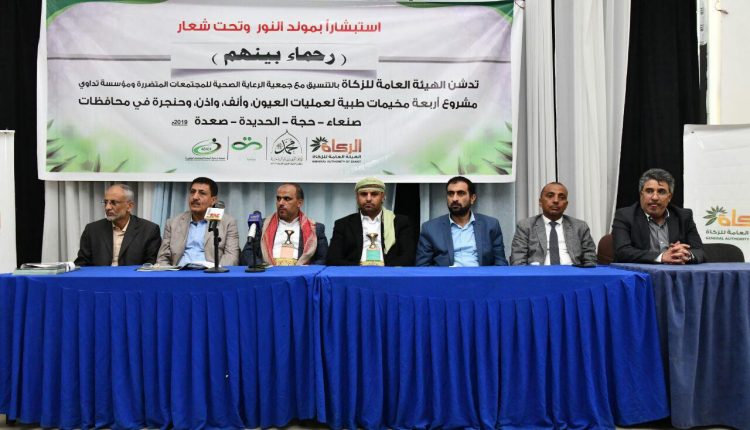 دشنت الهيئة العامة للزكاة اليوم مشروع أربعة مخيمات طبية في مجالات العيون, أذن، أنف، حنجرة بمحافظات صنعاء، حجة، الحديدة وصعدة .