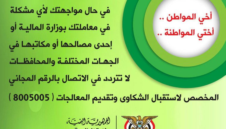 خصصت وزارة المالية في حكومة الإنقاذ الوطني الرقم المجاني “8005005” لاستقبال البلاغات والشكاوي وتقديم المعالجات لأي إعاقة في معاملات المواطنين المختلفة وذلك تنفيذاً لتوجيهات رئيس المجلس السياسي الأعلى المشير مهدي المشاط والهادفة لمكافحة الفساد في مؤسسات الدولة .