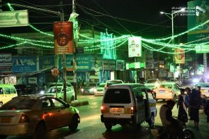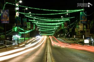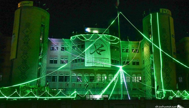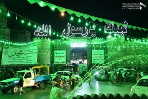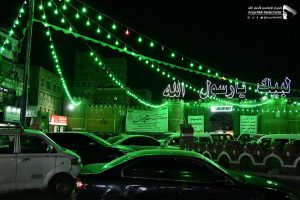 ازدانت شوارع العاصمة صنعاء بالأضواء، واكتست واجهات المنازل والمحلات التجارية والمباني الحكومية والمركبات بالألوان والشعارات الخضراء والبيضاء ابتهاجاً بالمولد النبوي الشريف.
