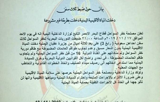 تعلن مصلحة خفر السواحل قطاع البحر الأحمر التابع لوزارة الداخلية اليمنية انه في يوم الاحد 17/11/2019م الساعة 21:00 ضبطت دورية خفر السواحل البحرية ثلاث سفن إحداهن سعودية (رابغ 3) على بعد 3 اميال من جزيرة عقبان اليمنية دخلت المياه الإقليمية اليمنية بدون إشعار مسبق وعدم تجاوب طواقم العائمات المضبوطة مع طاقم دورية خفر السواحل، وتم مناداتهم على القناة الدولية 16من قبل خفر السواحل اليمنية ولم يتجاوب طاقم العائمات المضبوطة، في تحدي واضح لكل القوانين الدولية البحرية وخرق للسيادة اليمنية مما استدعى ادخالهم الى رصيف ميناء الصليف واتخاذ الخطوات القانونية والتخاطب مع الجهات المعنية.