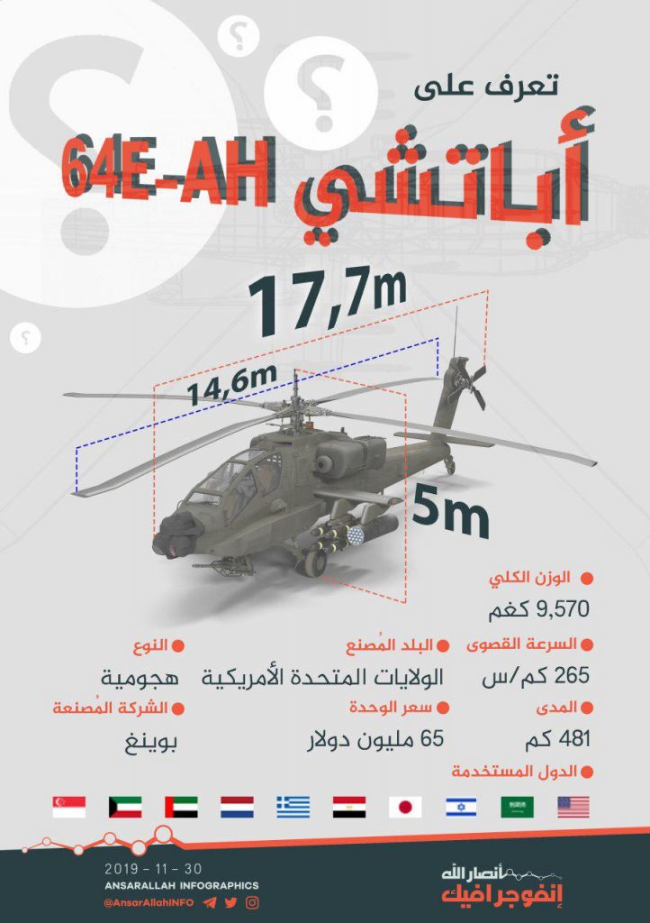 وهذا #إنفوجرافيك يبين كافة المعلومات لمروحية أباتشي “أي اتش 64” التي أسقطتها الدفاعات الجوية اليمنية.