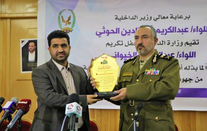 وتطرق الوزير الى ما قام به اللواء الخيواني منذ بدء العدوان على اليمن في 26 مارس 2015م، حتى اليوم، من رفع لمستوى الإنجاز الأمني والحد من الجرائم وتطهير اليمن من رجس الإرهاب والاعمال الاجرامية التي كانت تستهدف الجميع من دون استثناء.