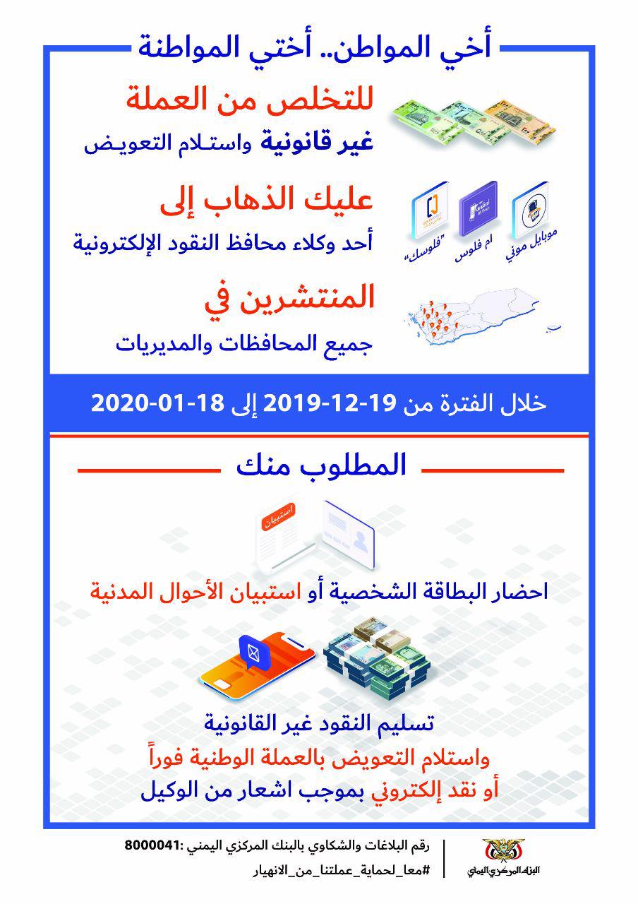 نشر البنك المركزي في صنعاء آلية تعويض العملة غير القانونية للمواطنين فعلى أي مواطن لديه نقد غير قانوني في حدود السقف المحدد بـ 100 ألف ريال أو أقل عمل الآتي: