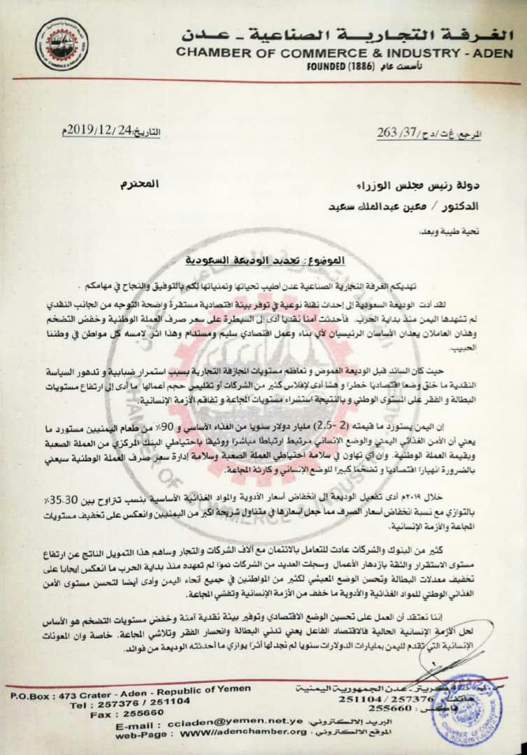دعت الغرفة التجارية والصناعية في عدن، رئيس وزراء حكومة الفنادق  بضرورة الإسراع في تجديد الوديعة السعودية، لتفادي خطر انهيار جديد للعملة والإقتصاد، خلال الأيام القادمة.