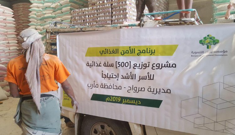 مؤسسة بنيان توزع 500 سلة غذائية للأسر الأشد إحتياجا بمديرية صرواح
