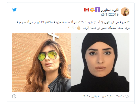 فايزة المطيري، نشرت صورة لنفسها بالحجاب وأخرى بدون حجاب بعد اعتناق المسيحية، عبر حسابها على موقع التغريدات القصيرة “تويتر“، ما أحدث موجة غضب بين النشطاء السعوديين.