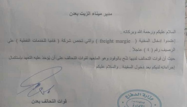 الوثائق التي حصلت عليها الصحيفة، تتضمن “توجيها” رسميا صادرا عن ما يسمى “قيادة العمليات المشتركة” بوزارة الدفاع السعودية، إلى “مدير ميناء الزيت” (التابع لمصافي عدن)، حيث يقضي التوجيه بإدخال سفينة مشتقات نفطية اسمها ( freight margie) تابعة لشركة فامبا للخدمات النفطية، إلى الميناء، بشكل “عاجل” بحجة أن “قوات التحالف لديها شح بالوقود وأن هذا هو المتعهد الوحيد لقوات التحالف”… “على ان يستكمل الإجراءات بعد دخول السفينة”.