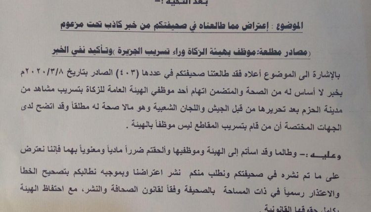هيئة الزكاة تنفي ماتناولته صحيفة “لا” باتهام أحد موظفيها تسريب مشاهد من مديرية الحزم لقناة الجزيرة وتدعوها للاعتذار
